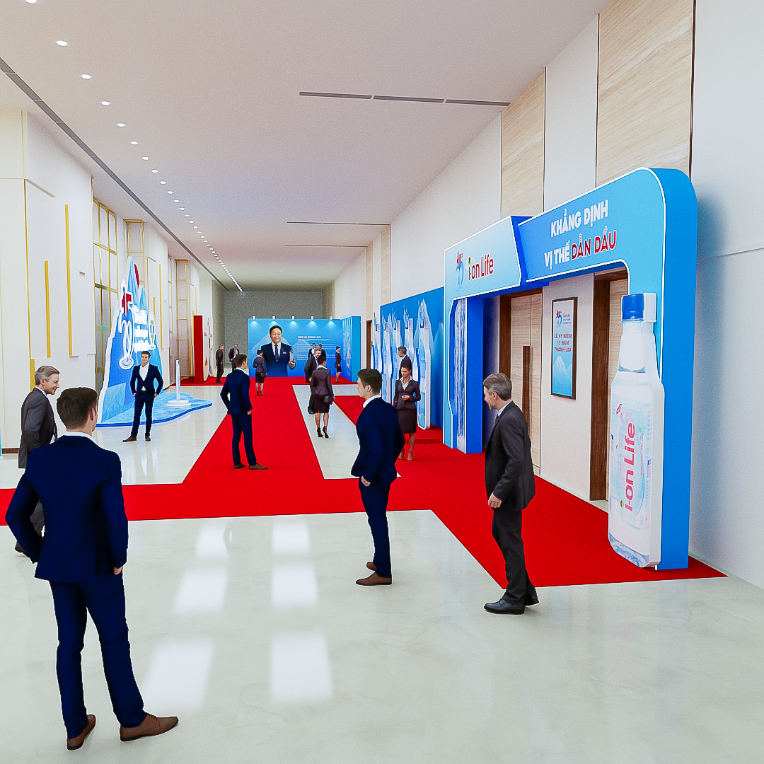 Không gian sự kiện được thiết kế đồng bộ với bộ nhận diện thương hiệu giúp khách hàng ghi nhớ hình ảnh và thông điệp doanh nghiệp.